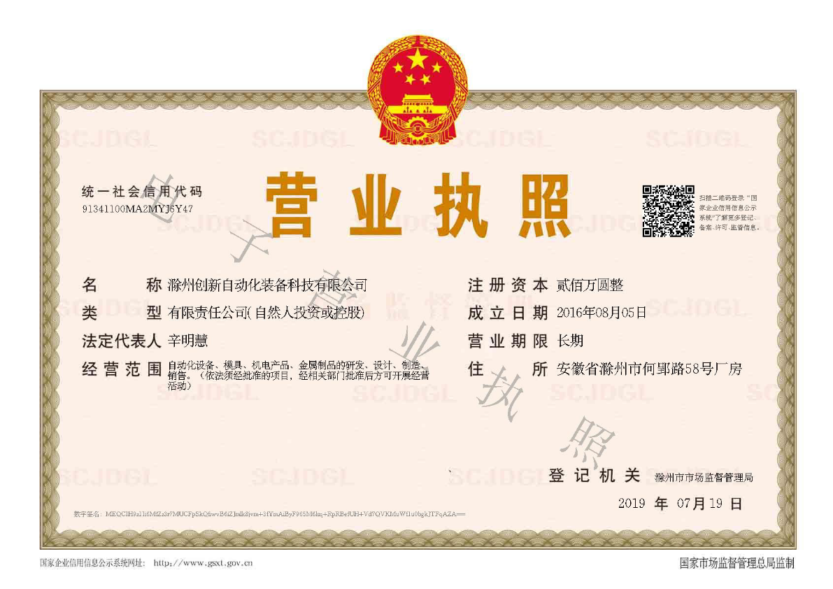 滁州創(chuàng)新自動(dòng)化裝備科技有限公司 版權(quán)所有 營(yíng)業(yè)執(zhí)照